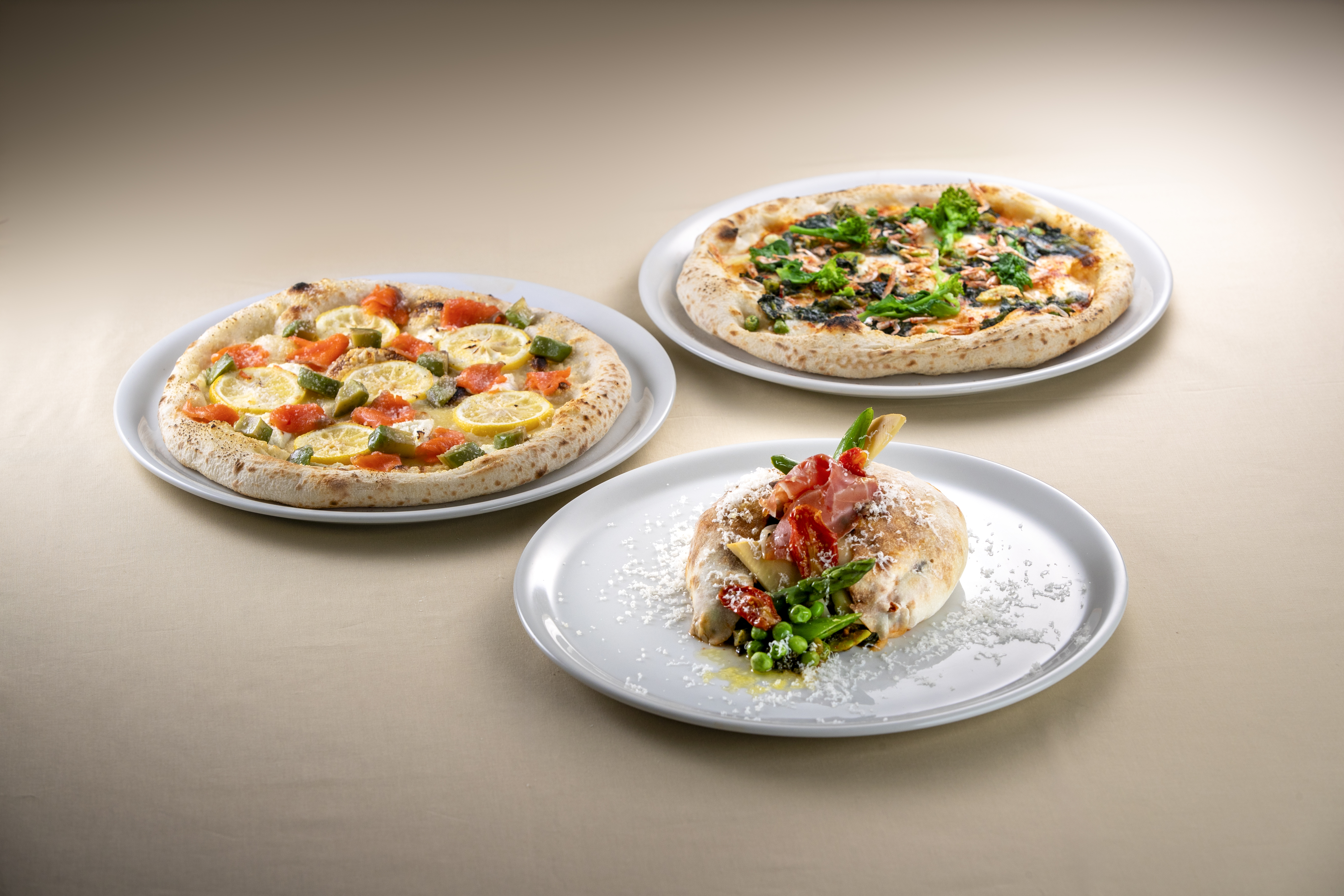 中央のピザ 彩春野菜と生ハムを閉じ込めたカルツォーネです。
